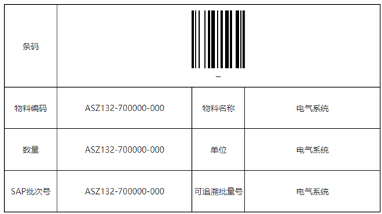“styles”: { “width”: “650px”, “height”: “360px”, “font-size”: “14px”, “text-align”: “center” }, “colgroup”: [ “14%”, “36%”, “14%”, “36%” ], “rowgroup”: [ “25%”, “25%”, “25%”, “25%” ], “thead”: [], “tbody”: [ [ { “type”: “text”, “value”: “條碼” }, { “span”: [ 1, 3 ], “type”: “attr-barcode”, “value”: [ { “type”: “attr”, “value”: “S_B_CODE” }, { “type”: “text”, “value”: “-” }, { “type”: “attr”, “value”: “S_B_SUPPLIER” } ], “compose”: true } ], [ { “type”: “text”, “value”: “物料編碼” }, { “type”: “attr”, “value”: “S_ITEM_CODE” }, { “type”: “text”, “value”: “物料名稱” }, { “type”: “attr”, “value”: “S_ITEM_NAME” } ], [ { “type”: “text”, “value”: “數(shù)量” }, { “type”: “attr”, “value”: “S_ITEM_CODE” }, { “type”: “text”, “value”: “單位” }, { “type”: “attr”, “value”: “S_ITEM_NAME” } ], [ { “type”: “text”, “value”: “SAP批次號” }, { “type”: “attr”, “value”: “S_ITEM_CODE” }, { “type”: “text”, “value”: “可追溯批量號” }, { “type”: “attr”, “value”: “S_ITEM_NAME” } ] ] } |