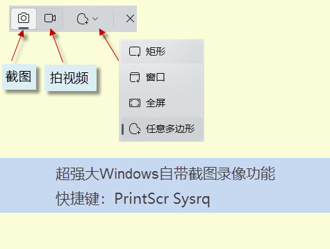 windows自帶截圖、錄屏功能(使用鍵盤中的PrintScr Sysrq 鍵實現),其位于鍵盤的右上方,按下此鍵,就可以實現在當前屏幕、錄屏,錄視頻等超級實用功能。